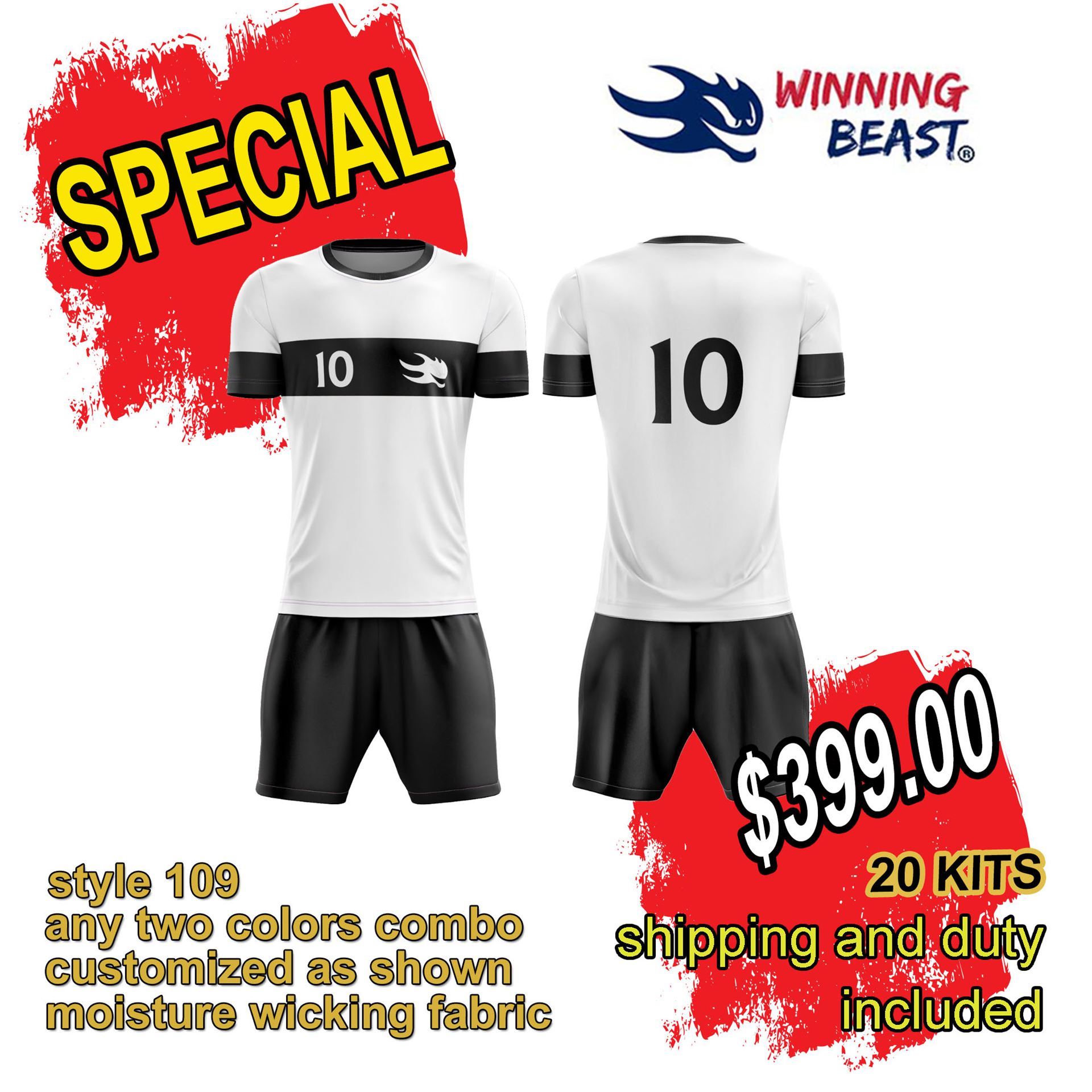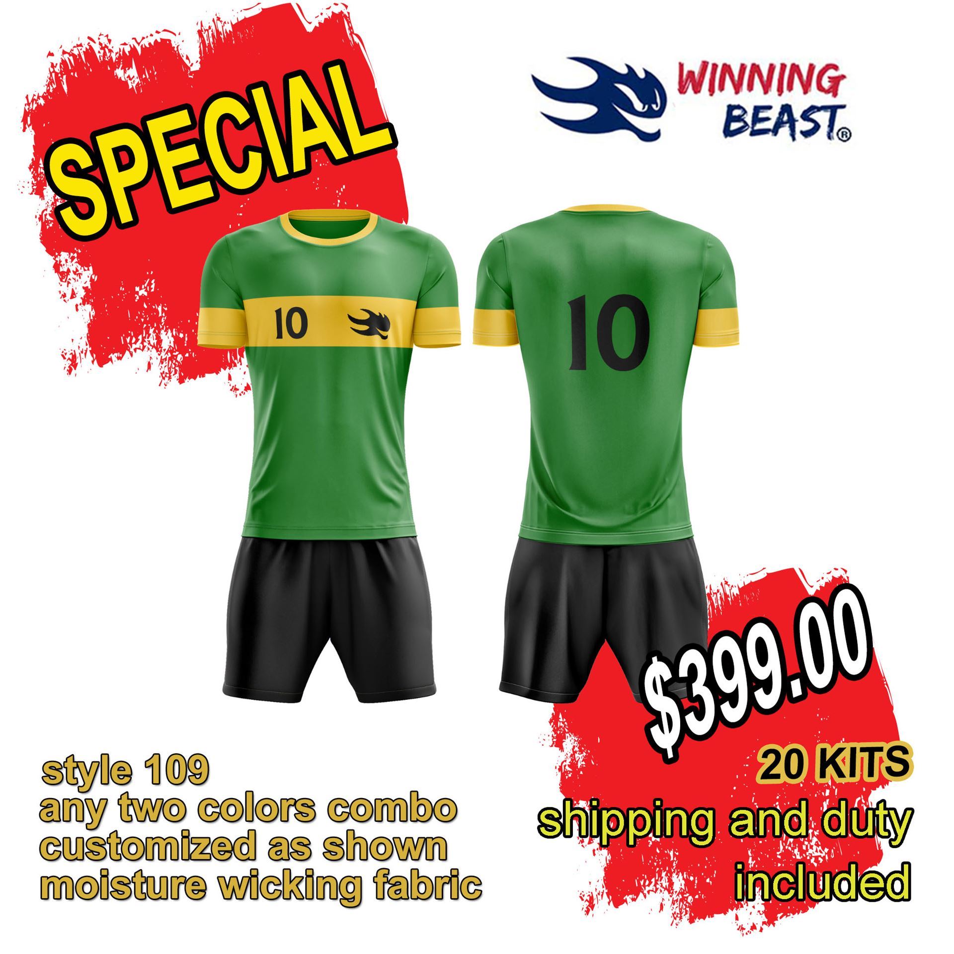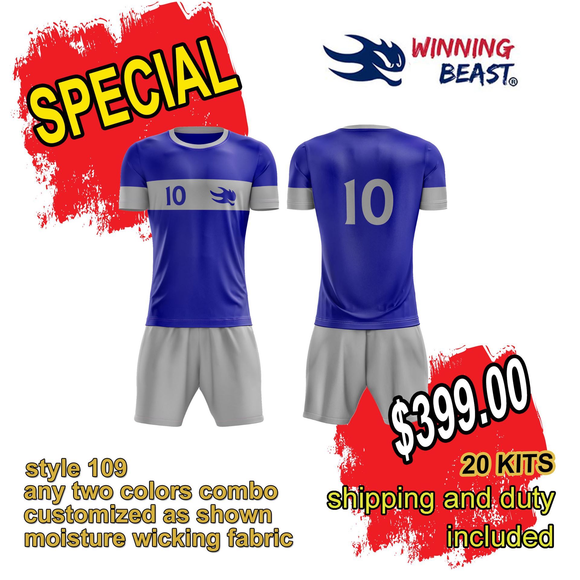 20 Style 109 Kit special package. This special price applies to purchases of 20 kits (jersey and shorts) that will be custom made to the colors of your choice and personalized with jersey numbers and Team Logo. Please use the CONTACT US link below to let us know your color choices and we provide pre-production drawings via email for your approval before we begin production. Satisfaction is guaranteed!
