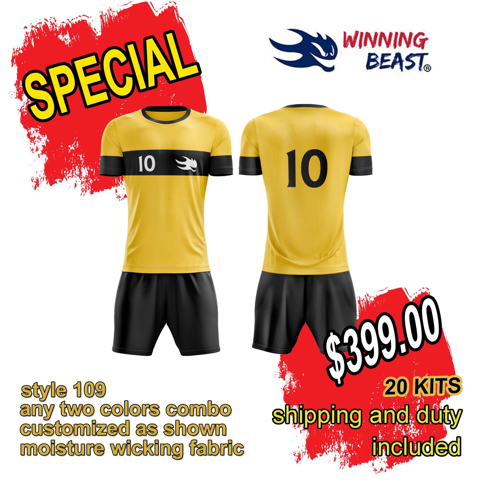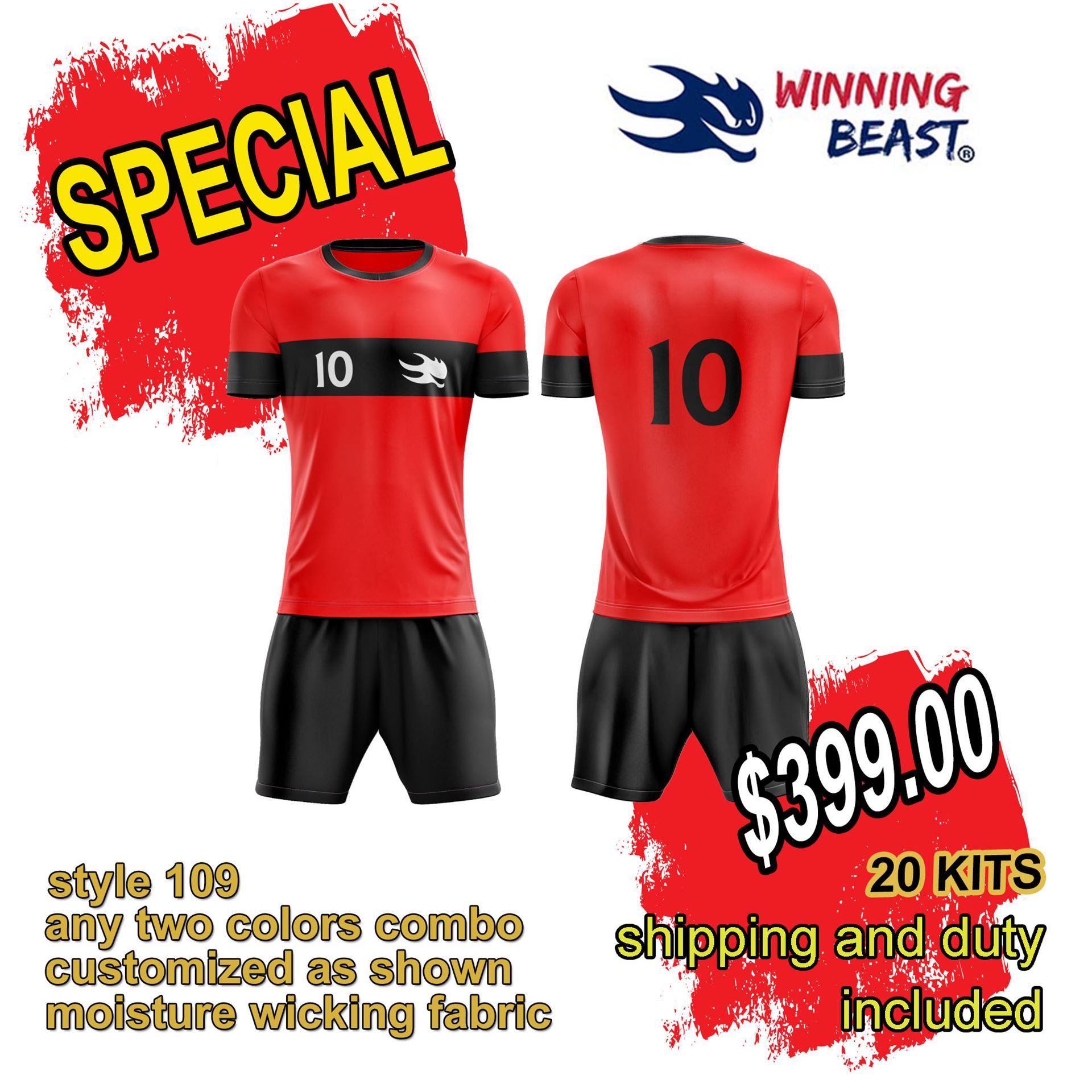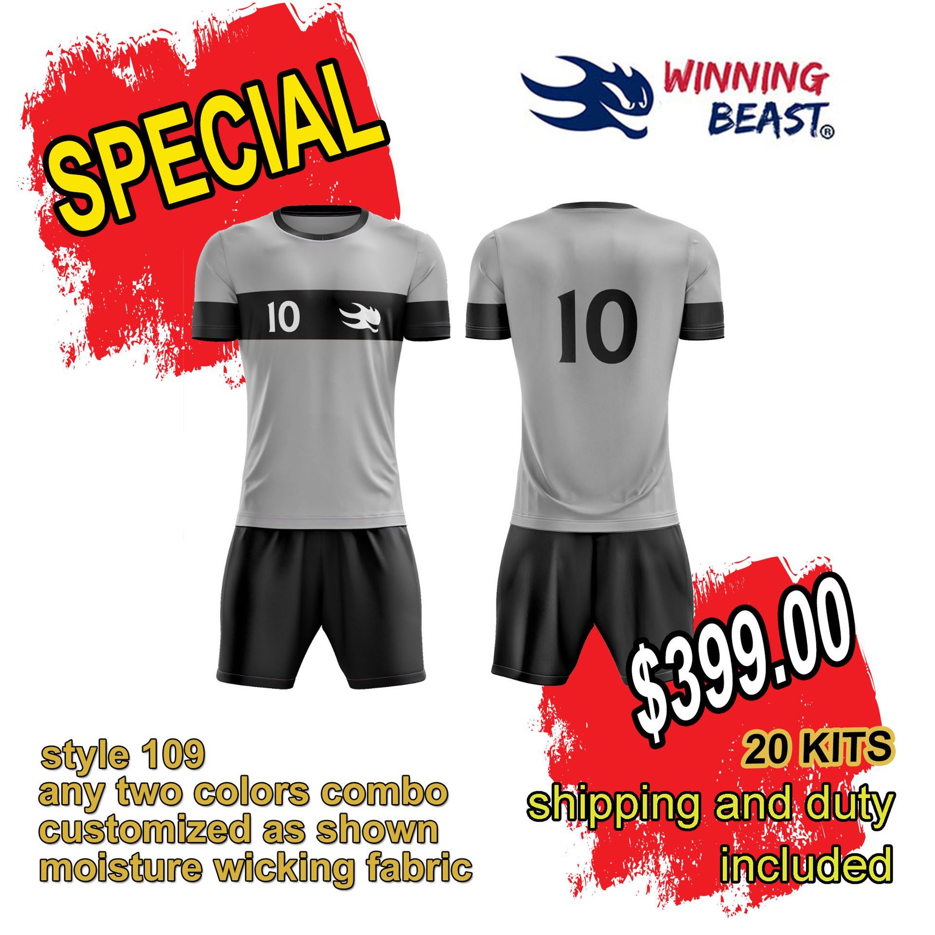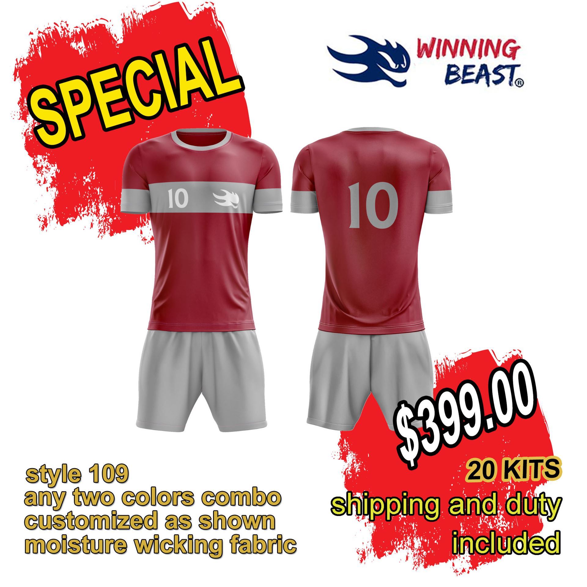 20 Style 109 Kit special package. This special price applies to purchases of 20 kits (jersey and shorts) that will be custom made to the colors of your choice and personalized with jersey numbers and Team Logo. Please use the CONTACT US link below to let us know your color choices and we provide pre-production drawings via email for your approval before we begin production. Satisfaction is guaranteed!