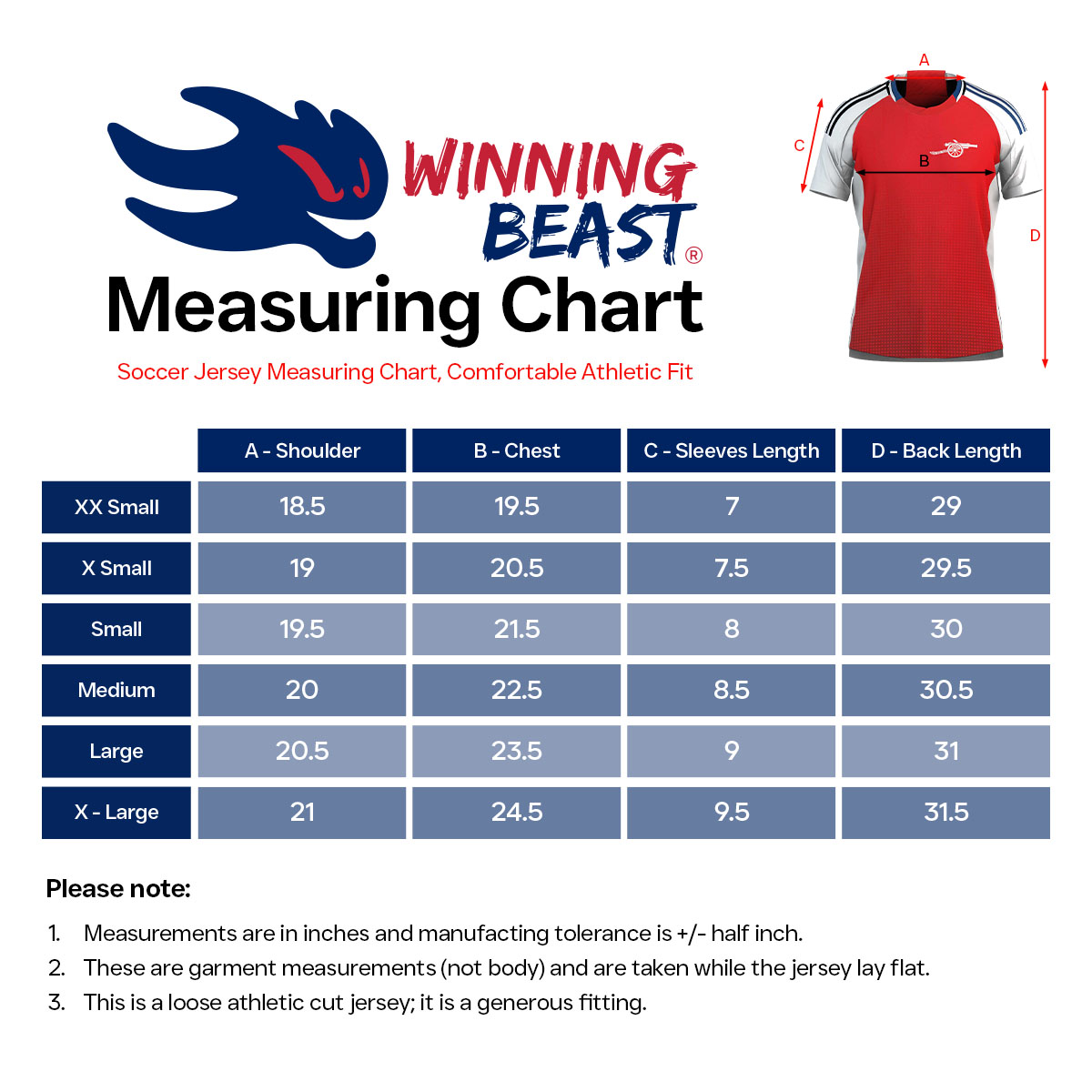 Winning Beast brings you the Arsenal Jersey 2024-2025 designed for fans who want style, comfort, and team pride in one. Made with Interlock Play Fresh fabric, this jersey feels soft and light on your skin, while helping to release heat and moisture so you stay cool and comfortable. The Arsenal soccer jersey features the team’s home colors (designed by Winning Beast) with the team crest sublimated into the fabric, so the colors won’t peel or fade. Built from 100% polyester microfiber, it’s lightweight at just 4 oz but strong enough for everyday wear. With American standard sizing, you can choose your size and get a perfect fit. The unisex cut makes it a great choice for both men and women, and the soft crew neckline, relaxed sleeves, athletic shape, and pull-on closure makes it easy to wear, also caring for your jersey is quick and simple, just machine wash and it’s ready to wear again. Get yours today!