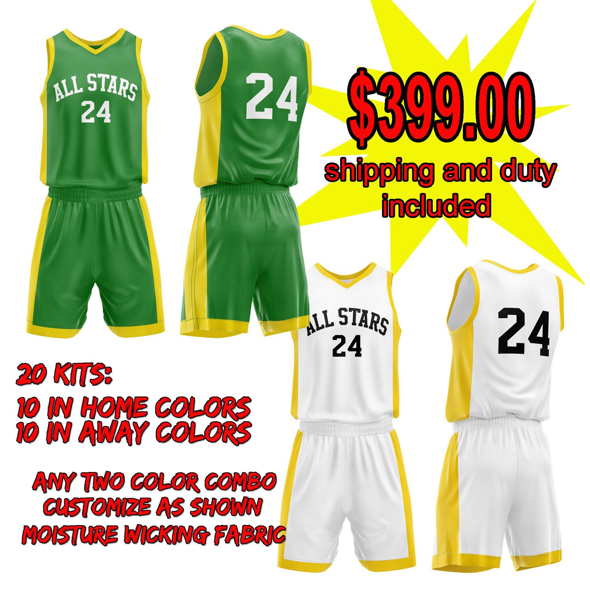 Home and away special package. This special price applies to purchases of 20 kits (jersey and shorts) that will be custom made to two colors of your choice and personalized with jersey numbers and logo/Team Name. Please use the CONTACT US link below to let us know your color choices and we provide pre-production drawings via email for your approval before we begin production. Satisfaction is guaranteed!