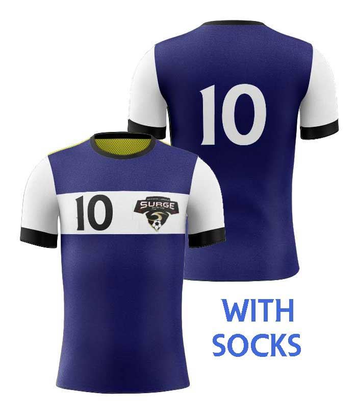 This custom made soccer jersey with socks kit is specially made for the Surge Soccer Club of San Marcos Texas. Satisfaction is guaranteed!